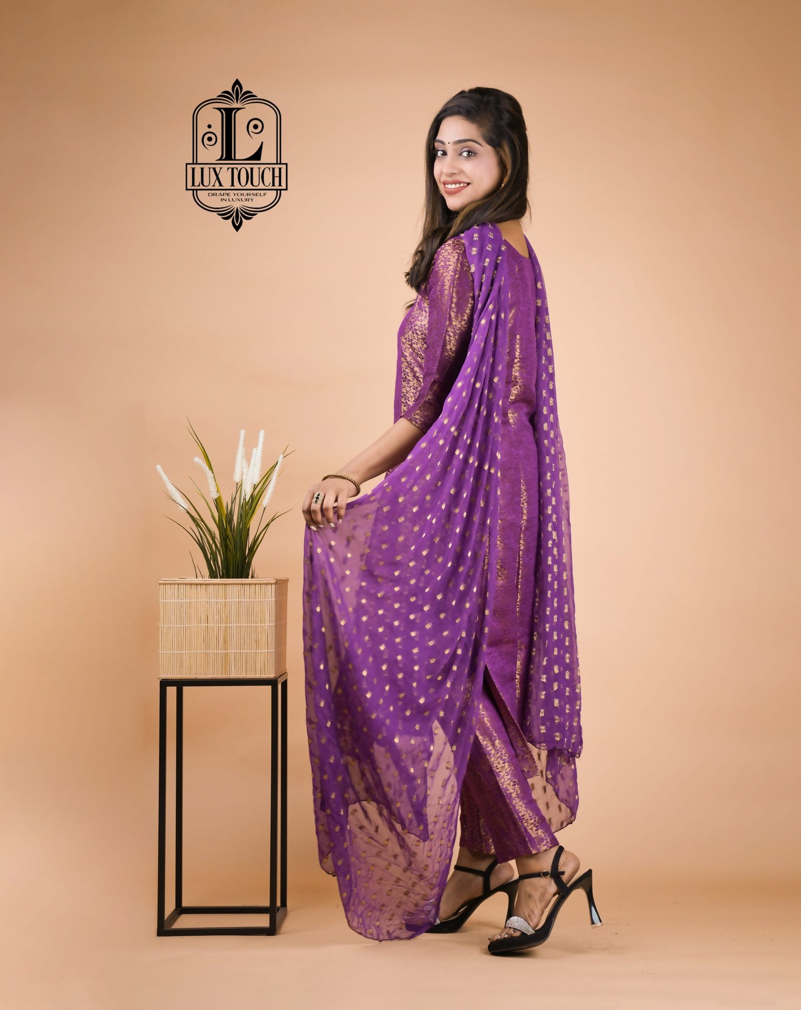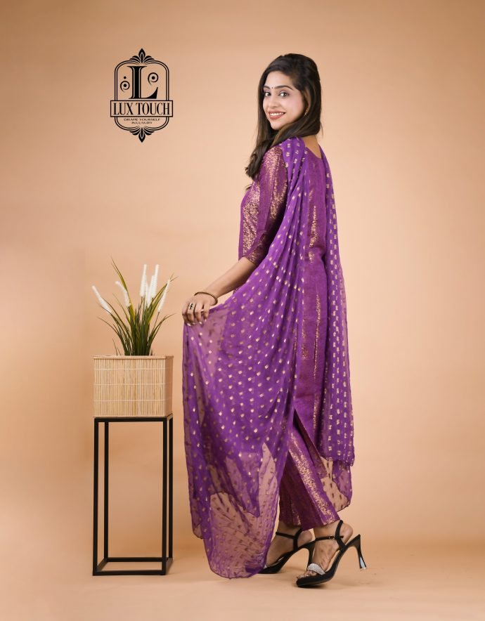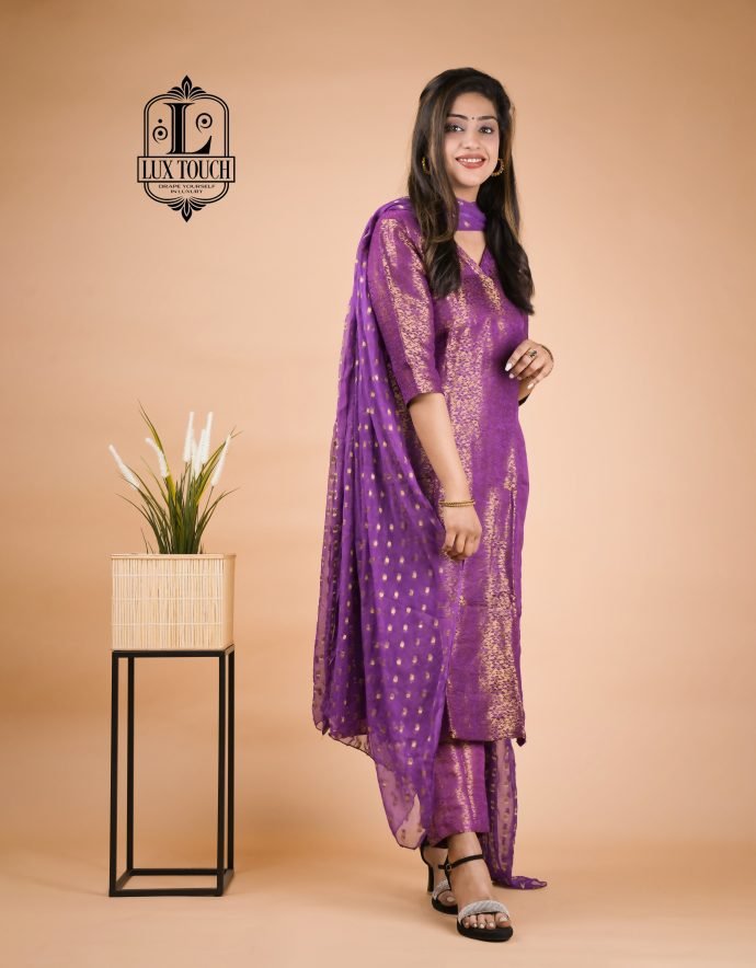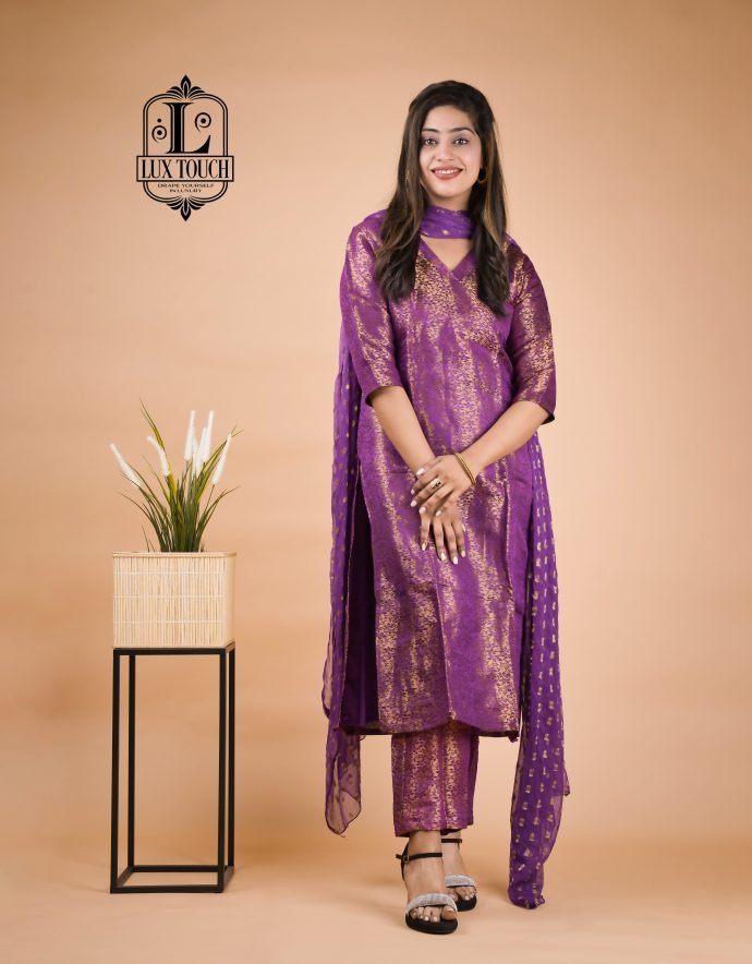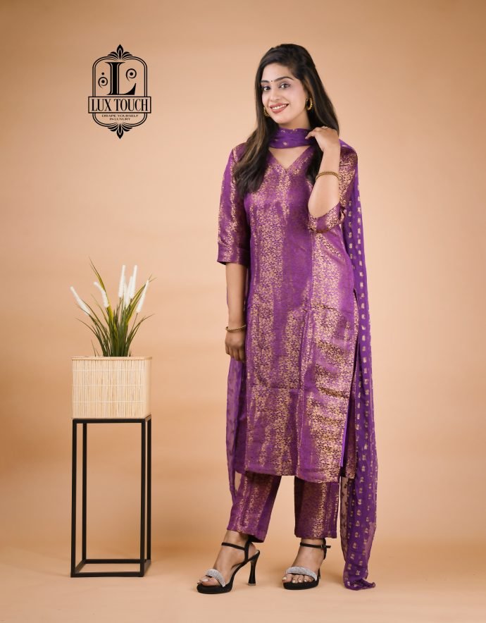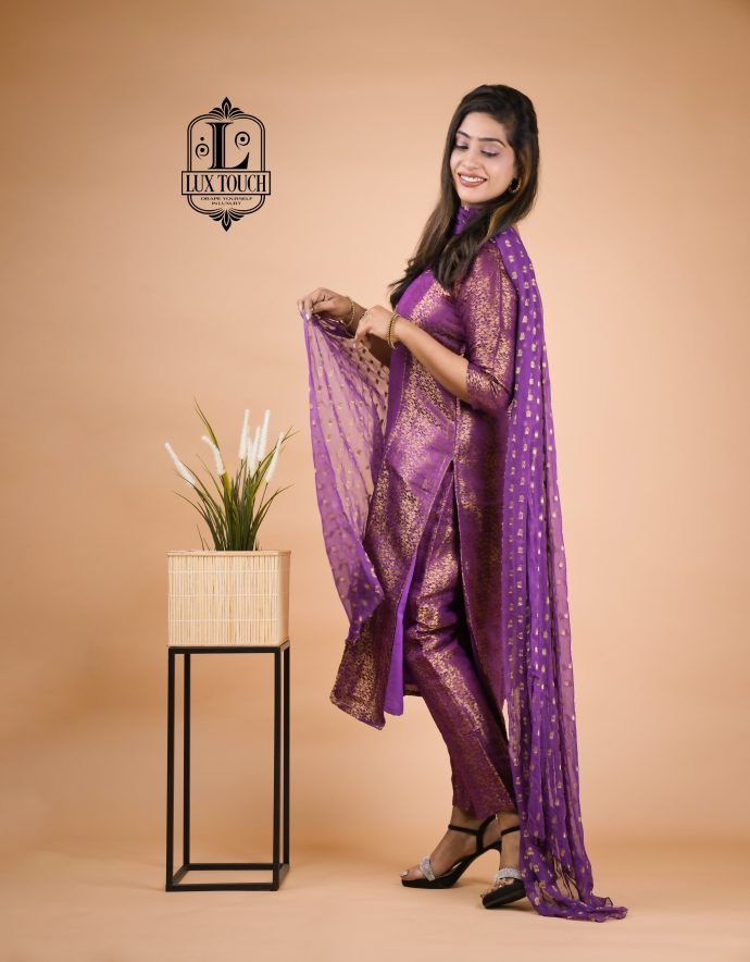 A Banarasi suit set is a beautiful representation of traditional Indian craftsmanship, known for its luxurious fabric and intricate designs. Originating from Varanasi, these sets are woven from fine silk, often interwoven with gold or silver threads, which give them a regal and opulent appearance. The kameez (top) is typically rich in traditional motifs like paisleys, floral patterns, and brocade work, with a soft sheen that enhances its elegance. The design often includes embroidery, sequins, or intricate weaving, showcasing the skill of artisans. Tailored to a flattering silhouette, the kameez may feature different necklines, such as round or V-shaped, adding to its versatility.