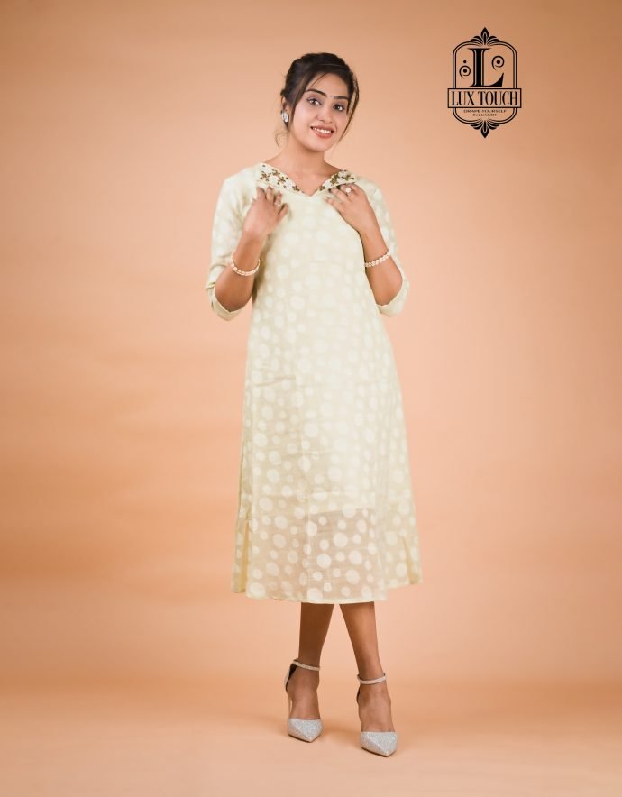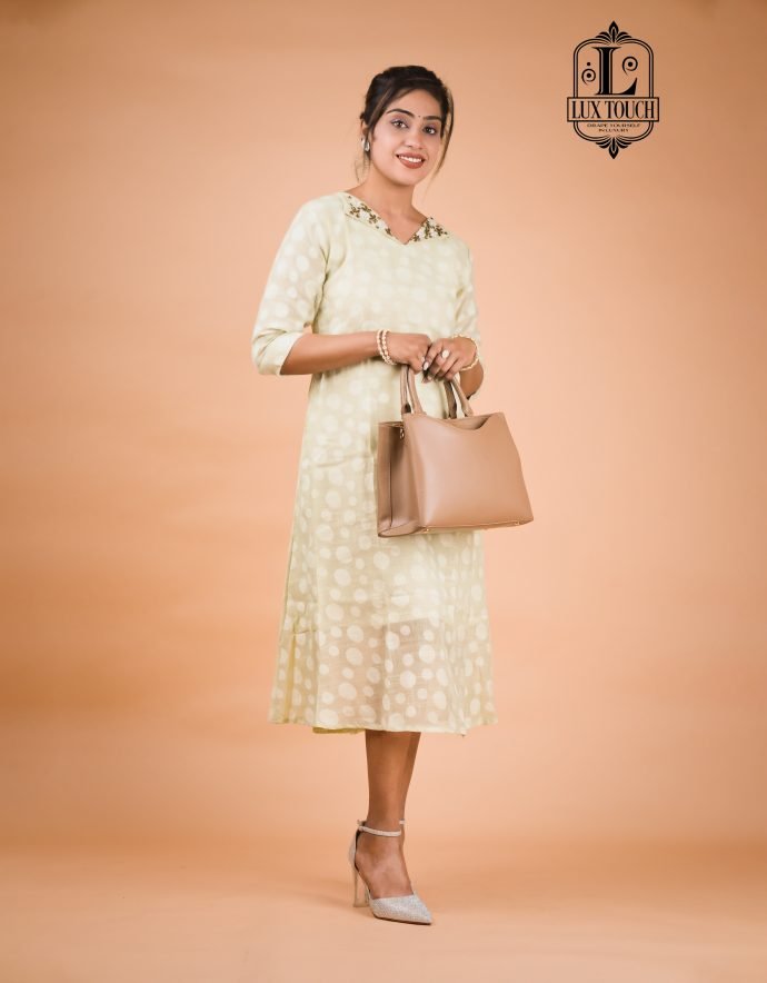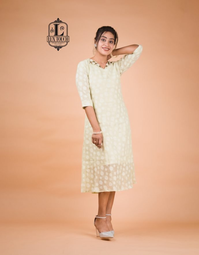 This kurti features a beautiful light yellow color with intricateĀ  handwork along the V-neckline . The fabric is lightweight, making it comfortable to wear for various occasions. It’s perfect for a chic and elegant look.