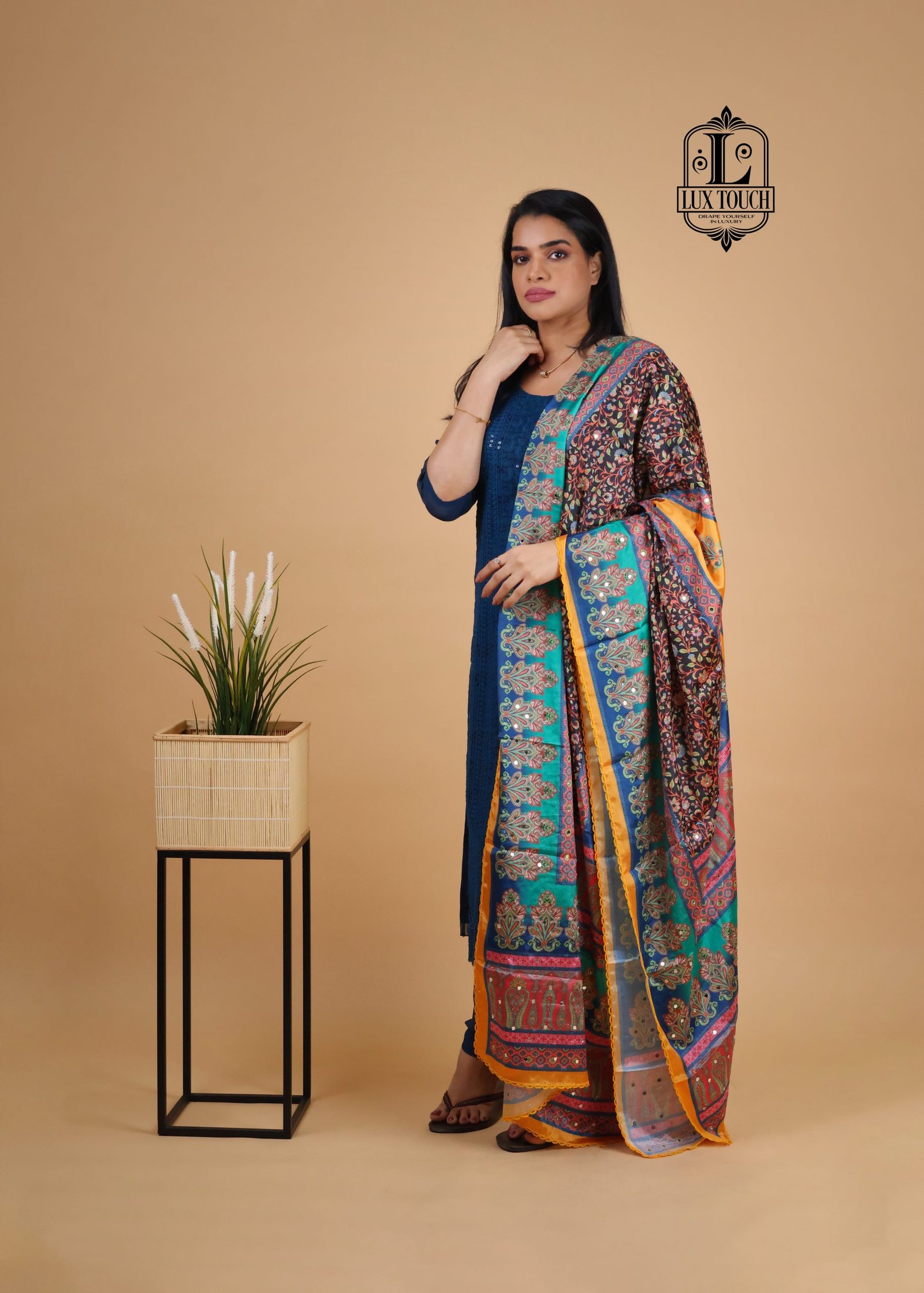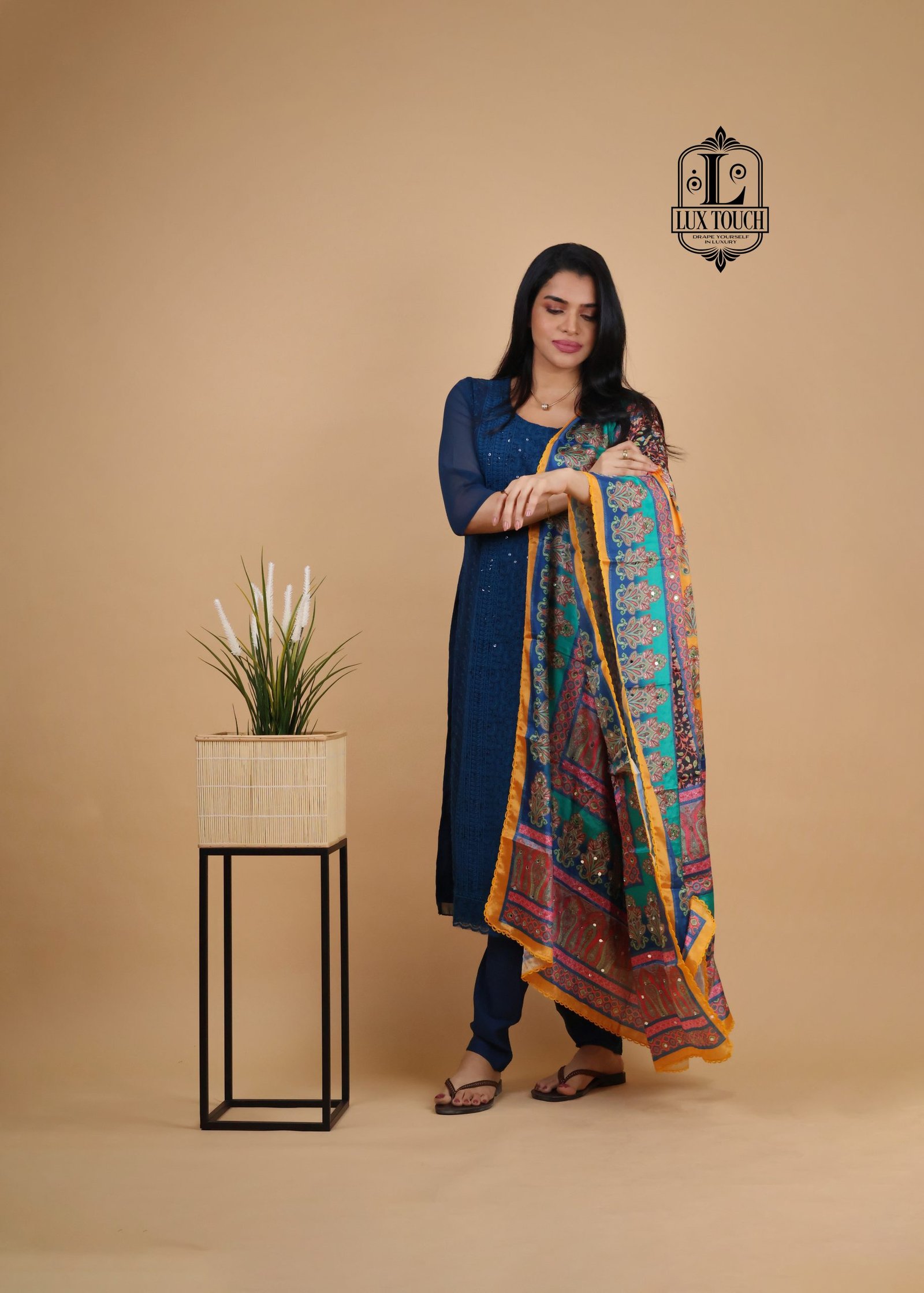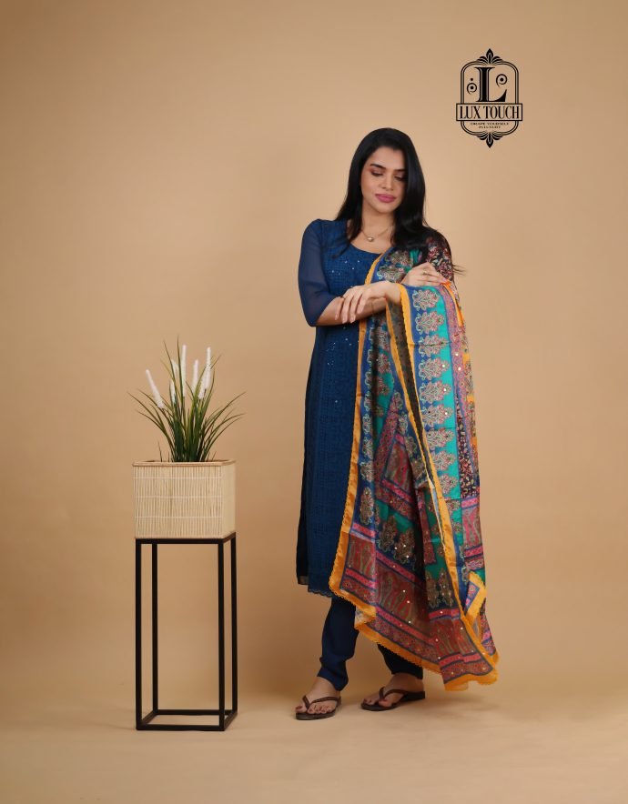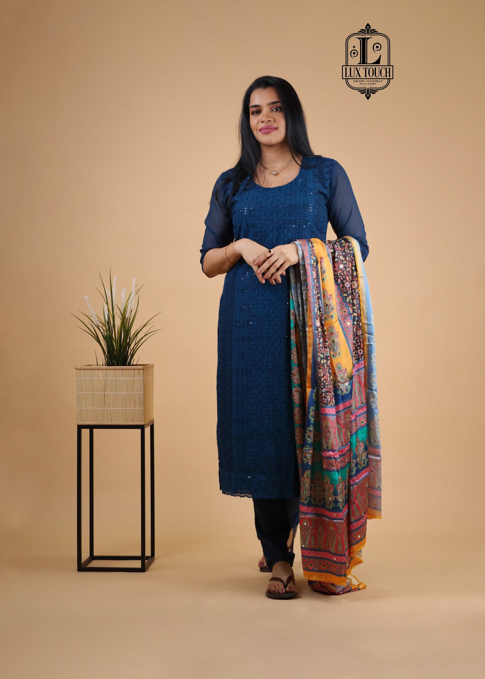 A Chikankari suit with a Pakistani dupatta combines the delicate artistry of Chikankari embroidery with the luxurious appeal of a Pakistani dupatta. This Chikankari suit, typically made of  georgette, features intricate geometric patterns. The Pakistani dupatta, often crafted from chiffon adds elegance with its rich mirror work.  This fusion creates a stunning ensemble, perfect for formal occasions, offering a blend of traditional refinement and vibrant embellishments, with the dupatta adding a bold contrast or complement to the suit.