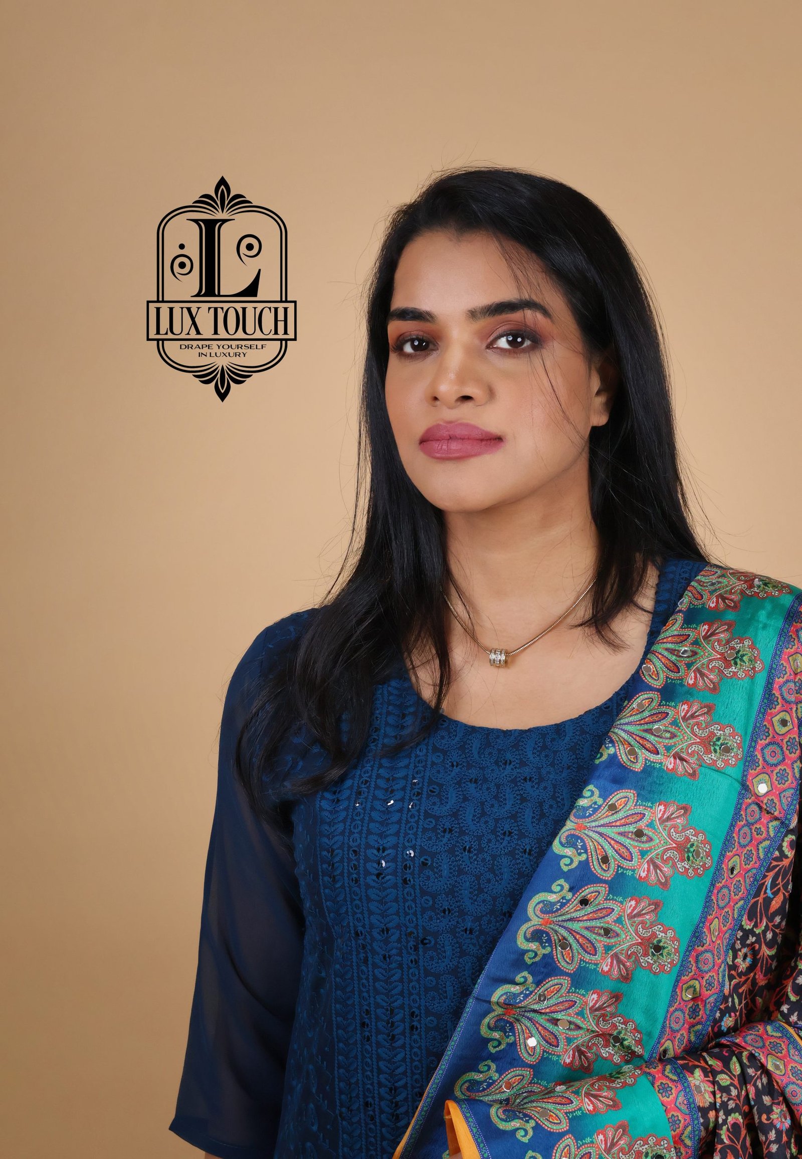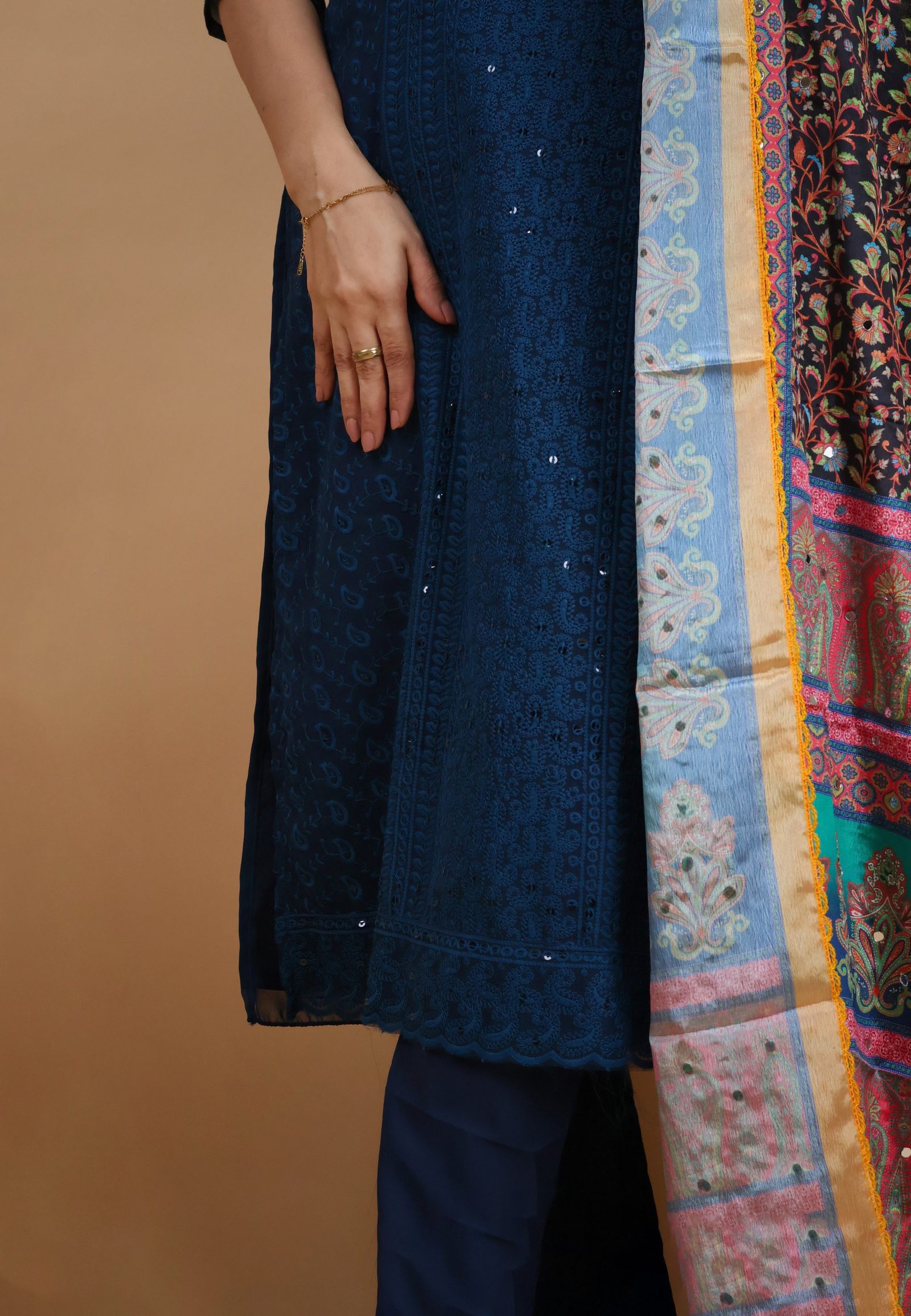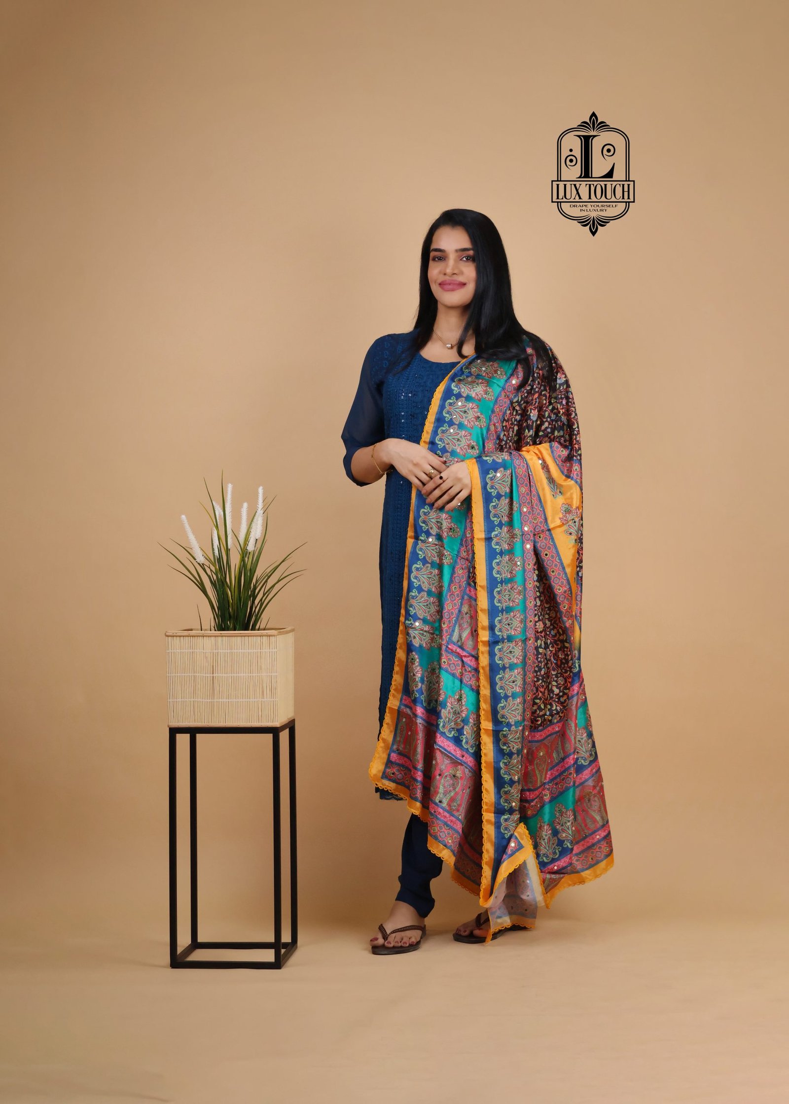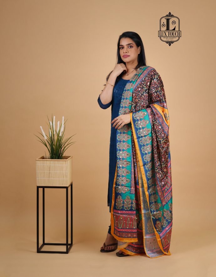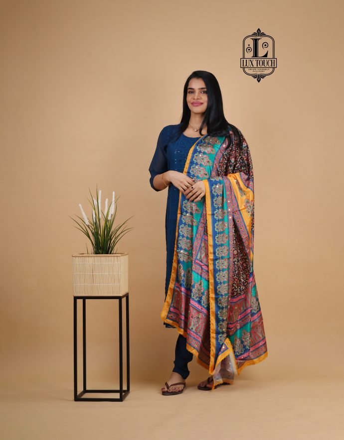 A Chikankari suit with a Pakistani dupatta combines the delicate artistry of Chikankari embroidery with the luxurious appeal of a Pakistani dupatta. This Chikankari suit, typically made of  georgette, features intricate geometric patterns. The Pakistani dupatta, often crafted from chiffon adds elegance with its rich mirror work.  This fusion creates a stunning ensemble, perfect for formal occasions, offering a blend of traditional refinement and vibrant embellishments, with the dupatta adding a bold contrast or complement to the suit.
