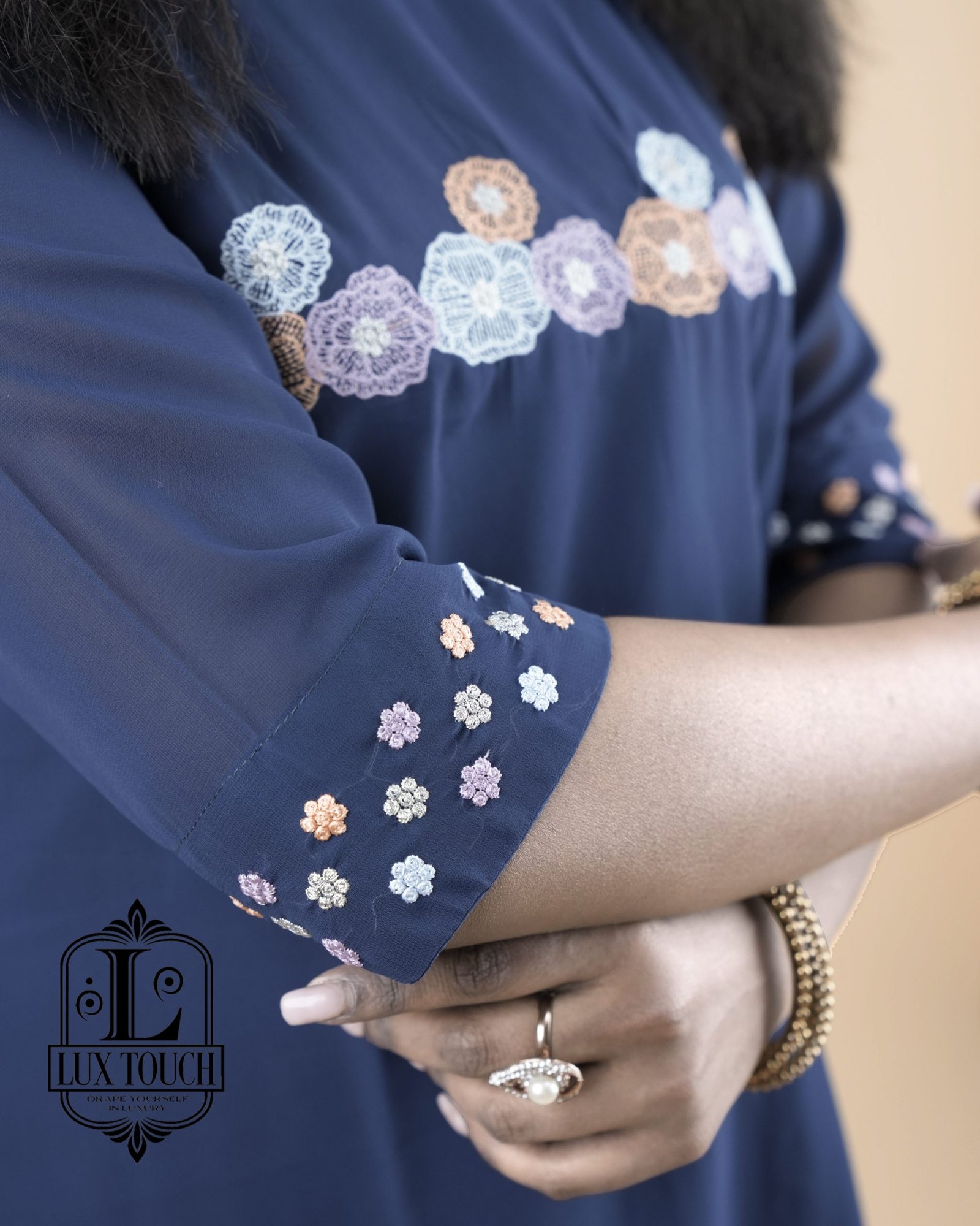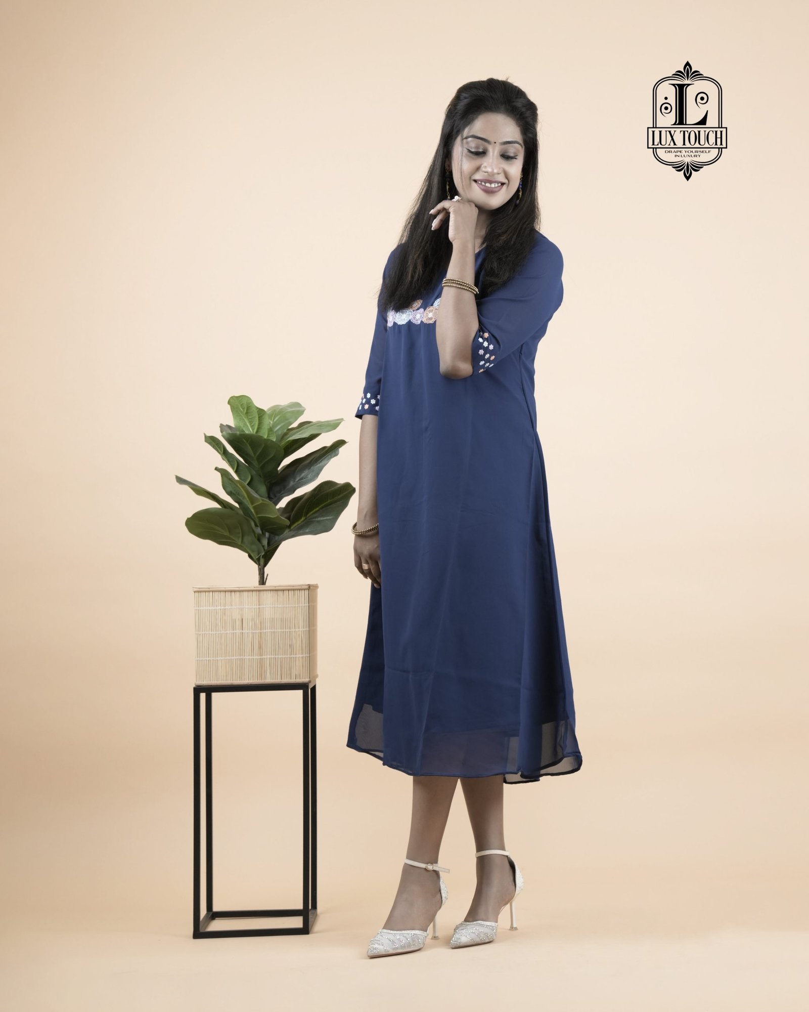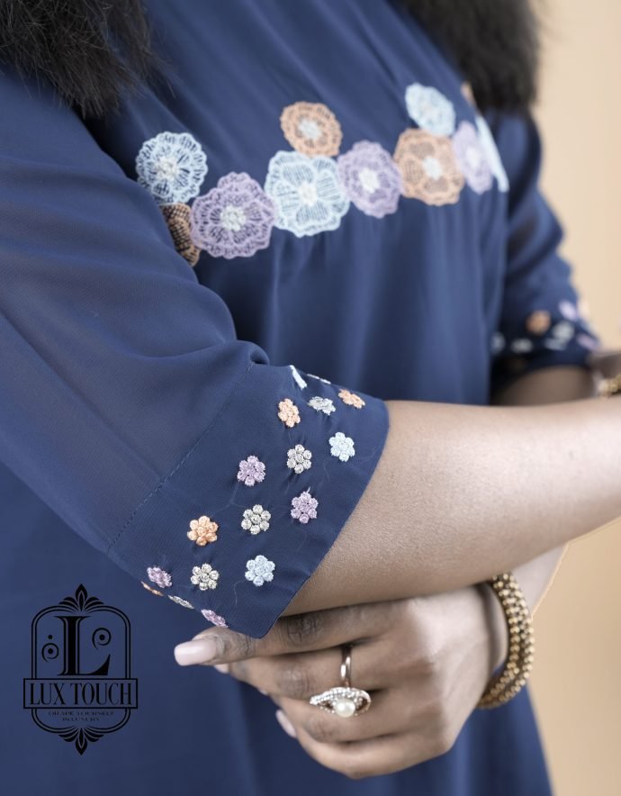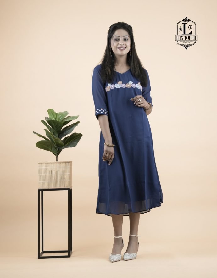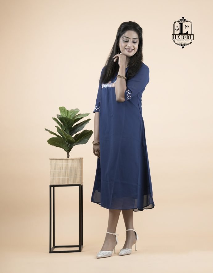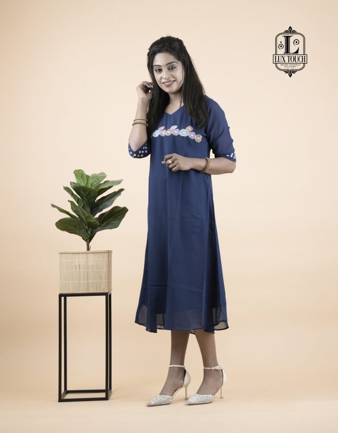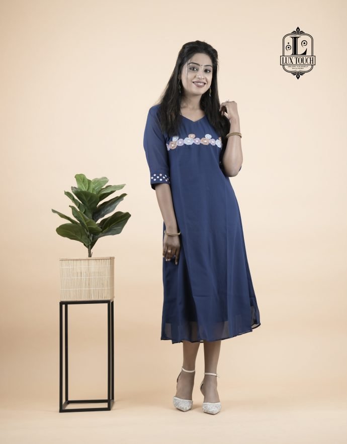 The dress in the image is a graceful navy blue A-line outfit that falls just below the knees, offering a modest yet stylish appearance. It features three-quarter sleeves adorned with delicate white embroidery near the elbows, adding a touch of elegance without being overly ornate. A matching band of white embroidery also runs horizontally across the chest, creating a balanced and eye-catching detail. The fabric appears to be lightweight and flowy, possibly georgette or chiffon, with a lining to ensure comfort and opacity. The dress has a simple round neckline and a clean, straight hemline, making it suitable for both casual and semi-formal occasions.