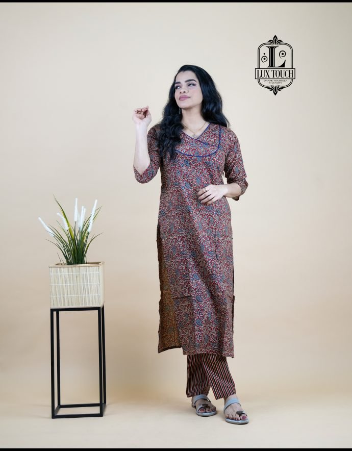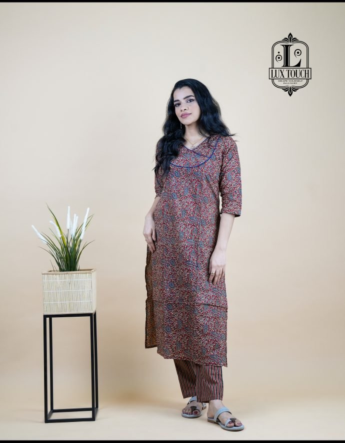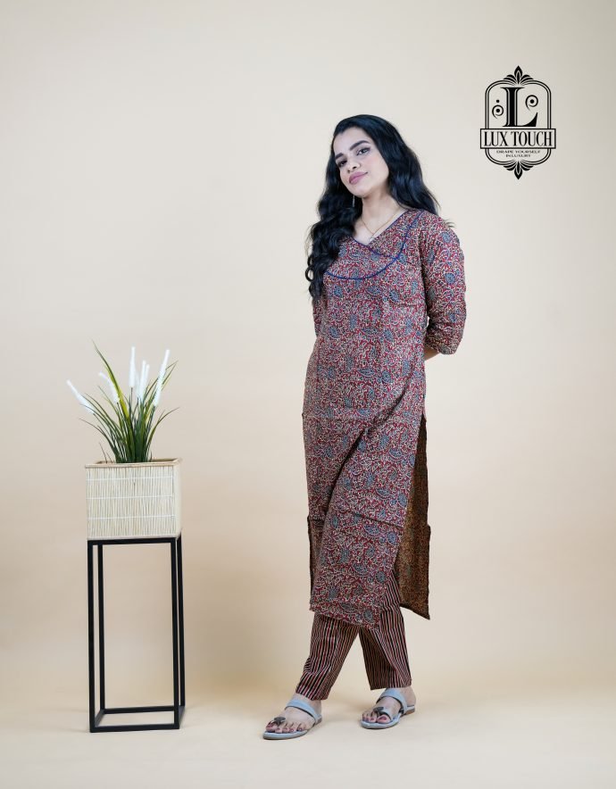 “Elevate your ethnic wardrobe with this beautifully crafted Kalamkari cotton co-ord set. Featuring intricate traditional prints inspired by Indian folk art, this set includes a coordinated top and bottom made from breathable, soft cotton. The natural dyes and earthy tones lend it a rustic yet elegant charm, perfect for festive gatherings, casual outings, or cultural events. Comfortable and effortlessly stylish, this ensemble blends heritage aesthetics with modern-day wearability.”
