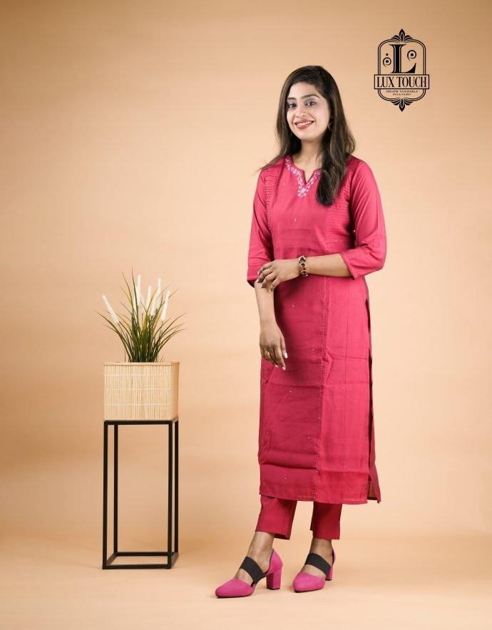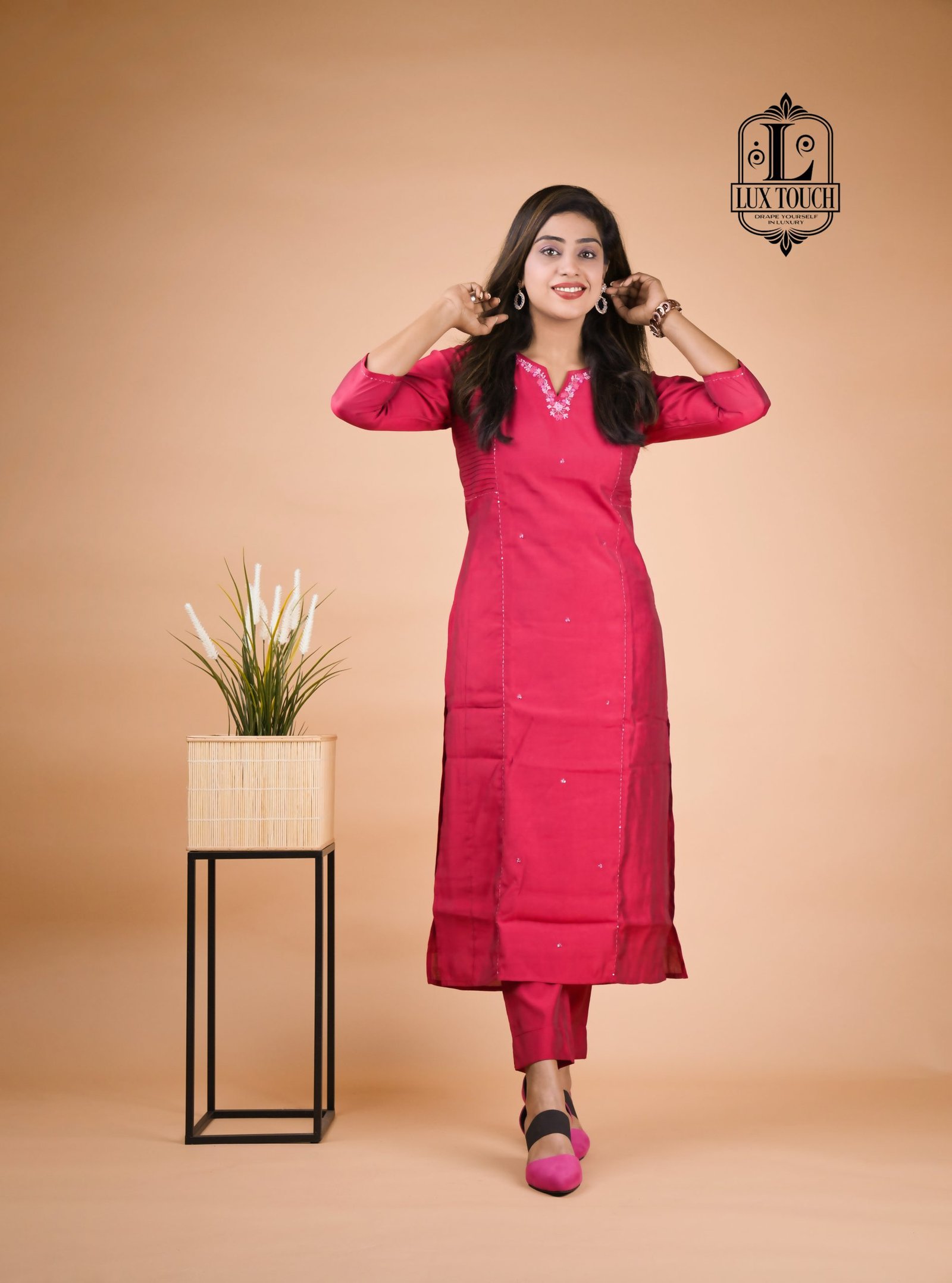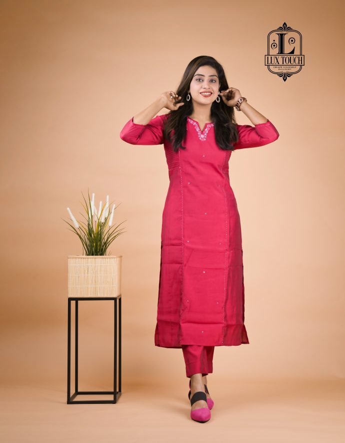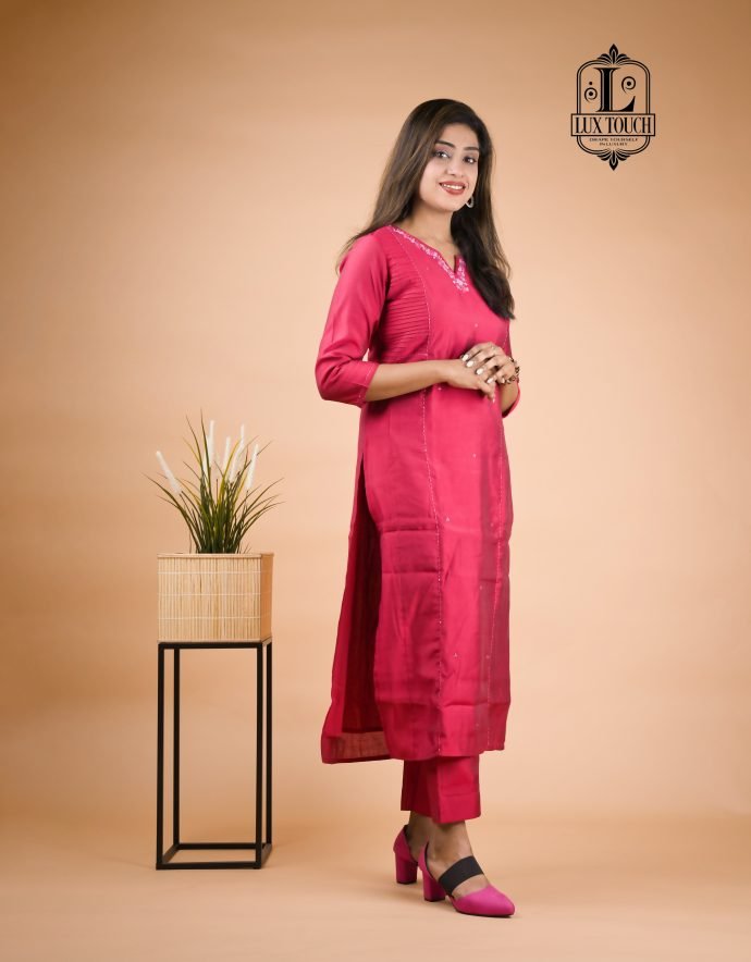 The standout feature of this set is the cord detailing, often seen in the form of drawstrings or decorative cords on the neckline, waist, or cuffs. These cords add a contemporary touch to the traditional fabric, elevating the overall design with a stylish, tailored finish. The set is perfect for casual or semi-formal occasions, offering a chic yet comfortable look. The rich, lustrous finish of muslin silk combined with the intricate cord accents makes this set a versatile and refined addition to any wardrobe.