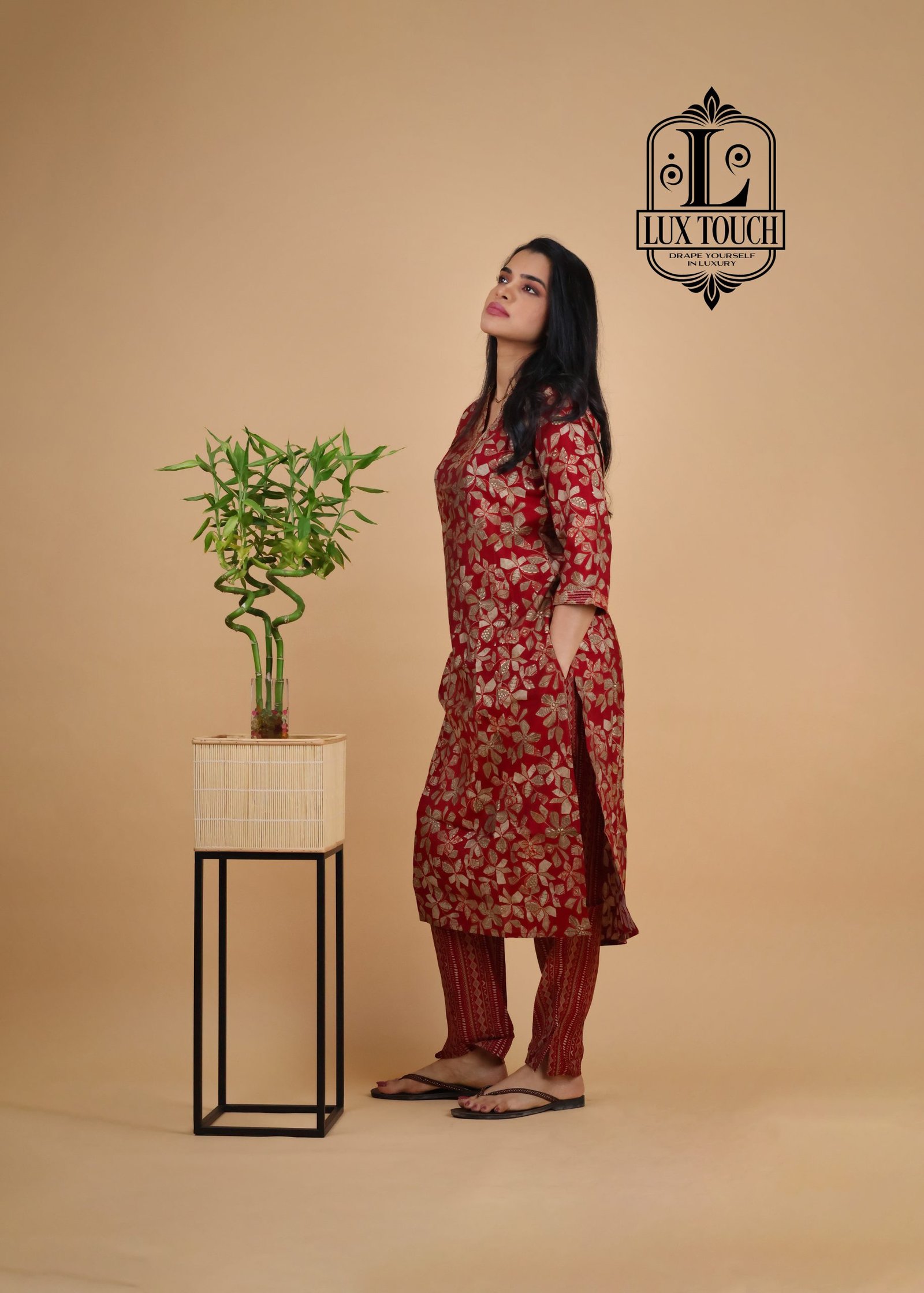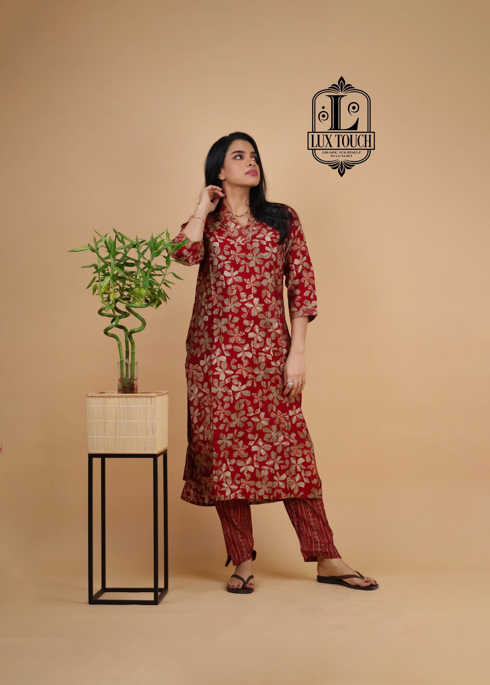 The standout feature of this set is the cord detailing, often seen in the form of drawstrings or decorative cords on the neckline, waist, or cuffs. These cords add a contemporary touch to the traditional fabric, elevating the overall design with a stylish, tailored finish. The set is perfect for casual or semi-formal occasions, offering a chic yet comfortable look. The rich, lustrous finish of muslin silk combined with the intricate cord accents makes this set a versatile and refined addition to any wardrobe.