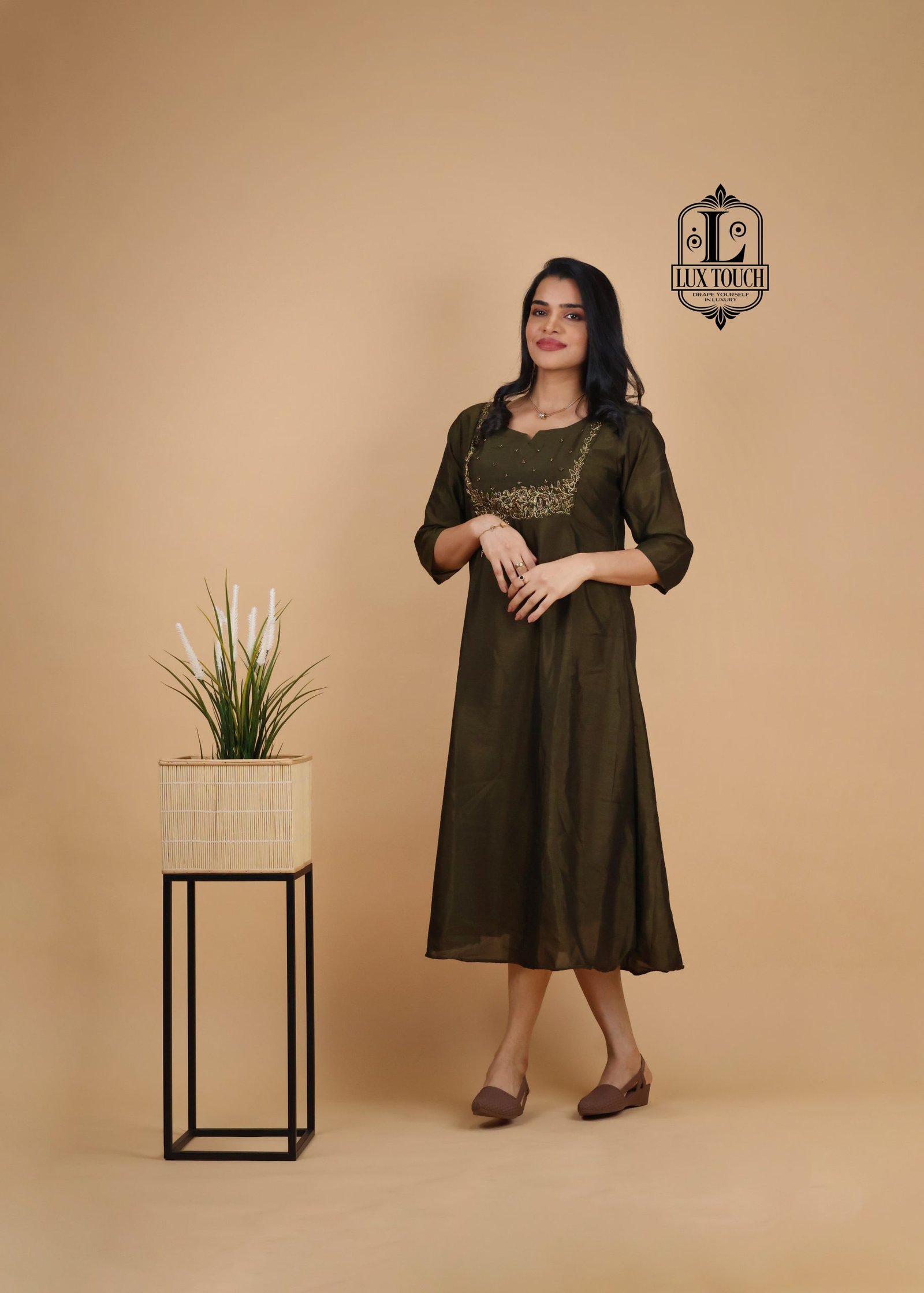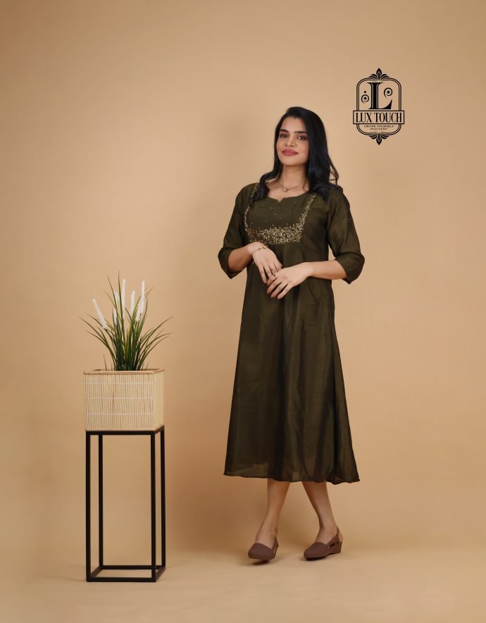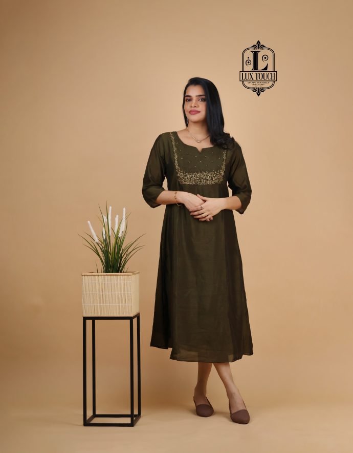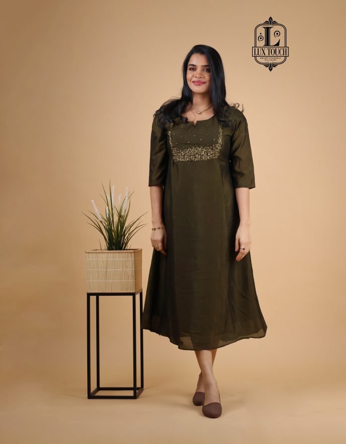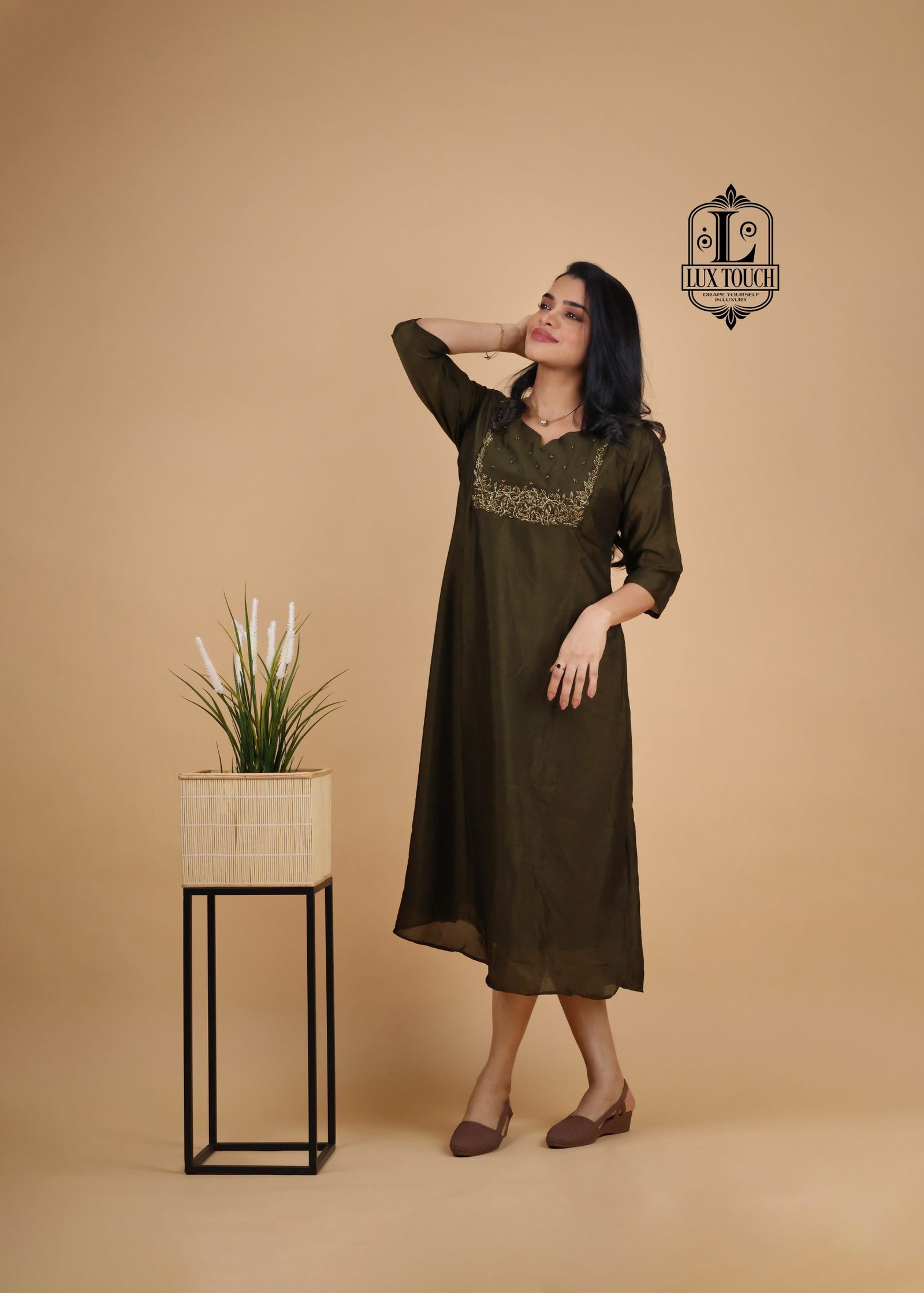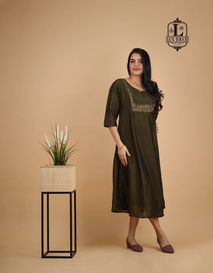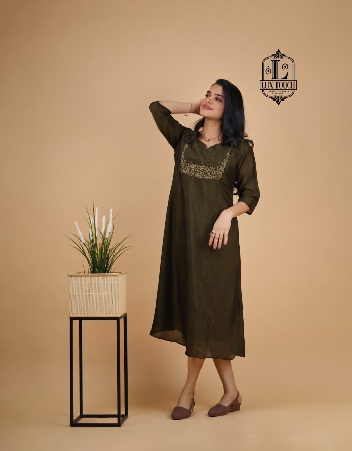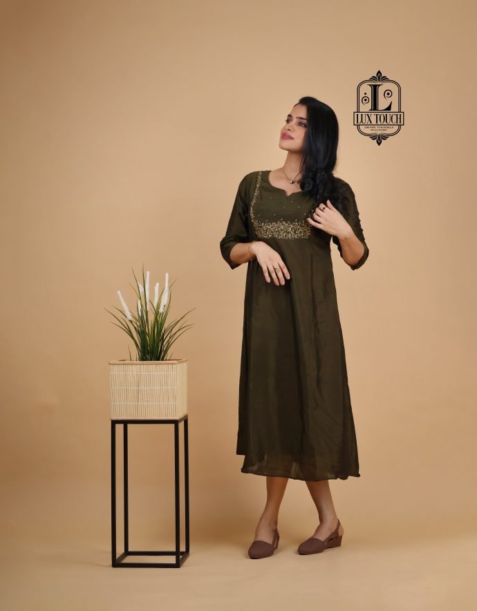 The Vichitra Silk Handwork Kurti is a beautiful fusion of rich tradition and contemporary elegance. Crafted from high-quality Vichitra silk, this kurti showcases exquisite handwork with intricate embroidery, adding a touch of grandeur to any wardrobe. The fine detailing and delicate craftsmanship make it a perfect choice for weddings, festive celebrations, or formal gatherings.